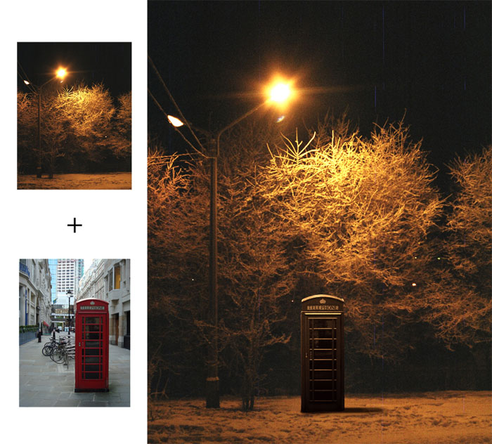 Настоятельно советую: старайтесь подбирать более тщательно исходники для коллажа, чтобы максимально меньше вносить изменений. Можно найти телефонную будку ночью, запорошить её снегом для реалистичности, добавить иней на стекла, пустить снежок вихрем…