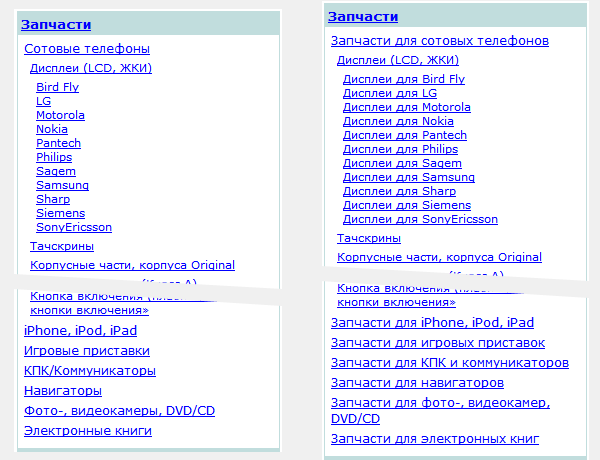 Как лучше обозвать подразделы категории Сначала было так, как слева. Сеошники дали рекомендацию сделать так, как справа, потому что, например, пункт |