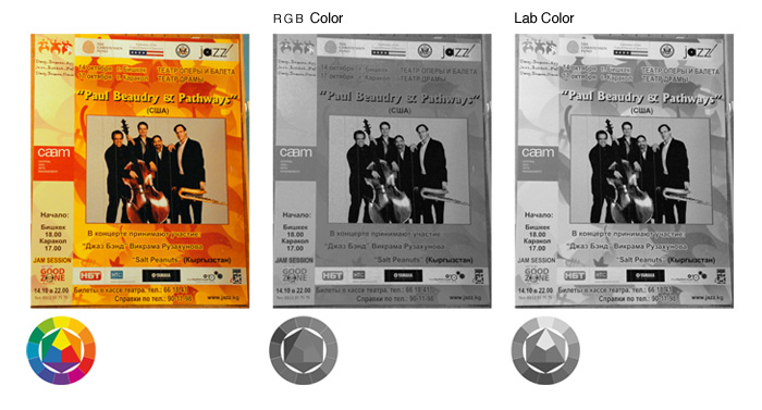 Артём, небольшое замечание: обесцвечивать стоит в режиме Lab, т. к. RGB почему-то считает, что жёлтый и фиолетовый являются цветами почти одинаковой светлоты.