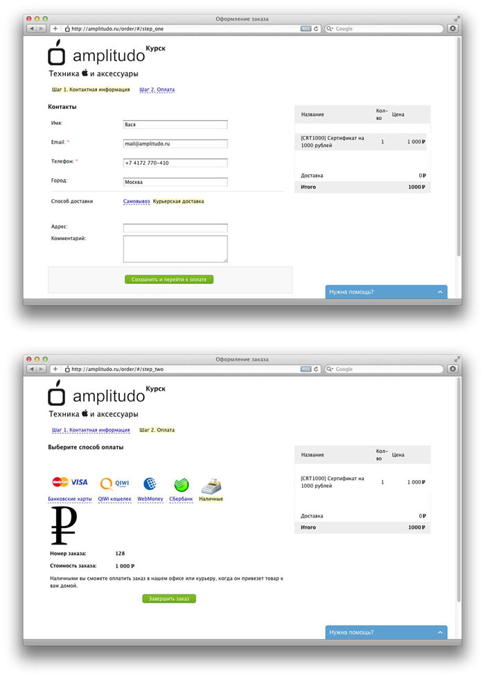 2. Содержимое второго экрана поместите на первый, под текстарею, и пусть там сразу будут выбраны «наличные курьеру». Таким образом мы сразу убираем как минимум один ненужный клик.