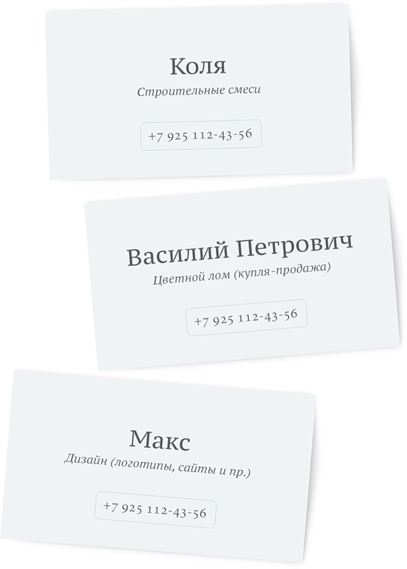 У визиток есть важное утилитарное качество — когда встречаешься с несколькими сотрудниками одной компании, практически невозможно сходу запомнить ни имена, ни кто есть кто. Я, к своему стыду, забываю прямо сразу после фразы: |