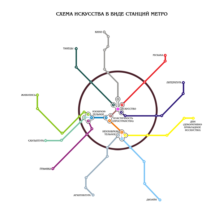 Денис, я совсем ничего не понял. Что символизируют линии? Что означают цвета? В чём смысл кольцевой линии? А станции? Что означают пересадки? Почему пересадки на кольцевой линии не обозначены как пересадки? Почему некоторые станции подписаны, а некоторые — нет? Мне не удаётся найти ни крупицы смысла ни в одном из аспектов этой картинки. Список, который вы привели в вопросе, тоже загадочен. Пластичность — это один из пяти видов искусства? Пластичность бывает изобразительное и неизобразительное? Дизайн — это вид неизобразительного пластичности? Простите, но, определённо, стоит вообще сделать Для начала попробуйте передать смысл простыми предложениями. |
