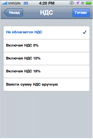 В приложении для Айфона есть экран, где необходимо выбрать ставку НДС. Это обычный список, полная аналогия выпадающего списка из веба. По умолчанию всегда выбран пункт Сейчас это список отсортирован по возрастанию, но есть предложение отсортировать его по частоте использования. Так как чаще всего встречается ставка 18%, при этом первым пунктом оставить