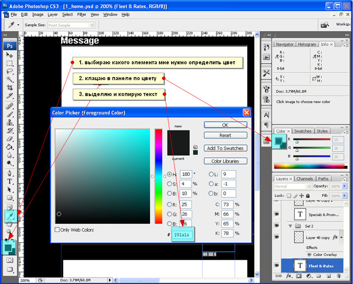 Я верстальщик, который часто работает в Фотошопе для создания шаблонов. У меня следующий вопрос: для определения цвета я использую пипетку, а чтобы скопировать этот цвет, мне приходится тыкать в поле с цветом, выделять его и потом только копировать.