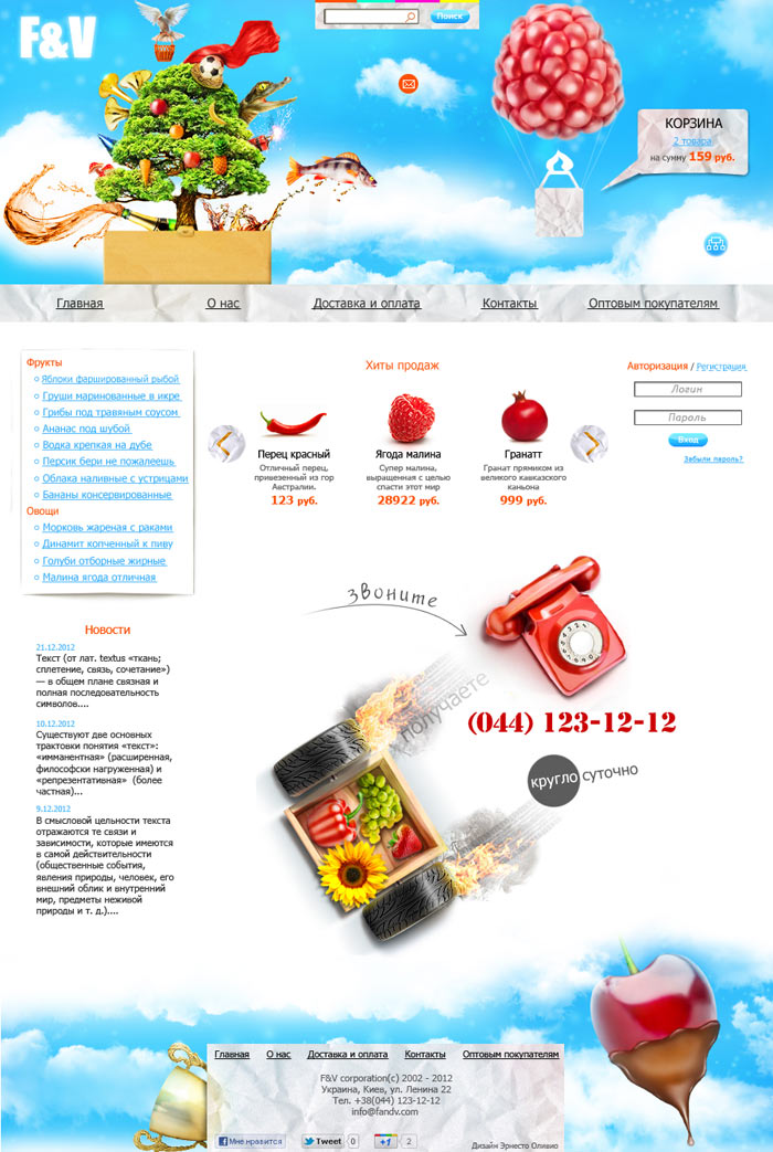 Даже не знаю, с чего начать. Нагромождение цветов, шрифтов и мусора. Неясно, как купить эту малину. Неясно, зачем звонить. Неясно, что это вообще всё такое. Звоните круглосуточно — получаете горящие суши, звоните менее настойчиво — не получаете? Или это не суши? Зачем авторизация, и что это? Кажется, самое важное тут — это новости Извините. Честно говоря, я искренне расстраиваюсь, когда вижу такие работы. Если вы продаёте малину, сфотографируйте её как следует и расскажите простым русским языком, чем она хороша и как её купить. Например: |