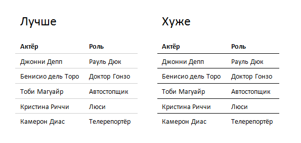 1. Если линейки всё‑таки используются, не стоит делать их такого же насыщенного цвета, как основной текст таблицы. Достаточно, чтобы линейки просто были заметны, поэтому подойдёт бледно‑серый цвет или ещё какой‑нибудь бледный.