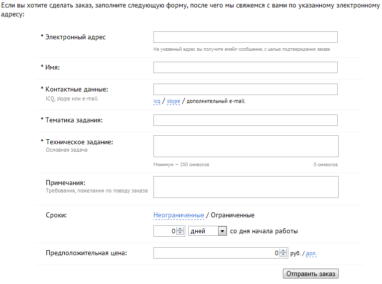 Упрощаем и уточняем формулировки. «На указанный адрес вы получите емэйл-сообщение» — ок, передаём привет Капитану Очевидность и убиваем. Убираем нелепое ограничение в 250 символов. Убираем весь мусор: звёздочки, двоеточия, линеечки, серенькие текстики, счётчики символов. Пытаемся угадать, как работают поля «Контактные данные» и «Сроки», переводим на понятный язык форм. Ставим съехавшую кнопку на место.