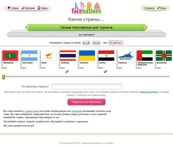 Фильтр по критериям с чекбоксами и бегунком — это слишком заумно и заморочено. В чём полезное действие? К сожалению, раздел Пусть сайт покажет мне несколько стран с коротким текстом о том, чем они круты, причём так, чтобы они были круты разным: древней архитектурой, красивой природой, спортивными курортами, развлечениями для детей. Вместо флагов будут фотографии того, что в этих странах круто. Нажал на страну — смотришь про неё, а рядом написано, что ещё круто в этой стране и какие есть другие страны, в которых это тоже круто. Главный вопрос — откуда взять данные. Глупо ждать, что люди пойдут к вам |