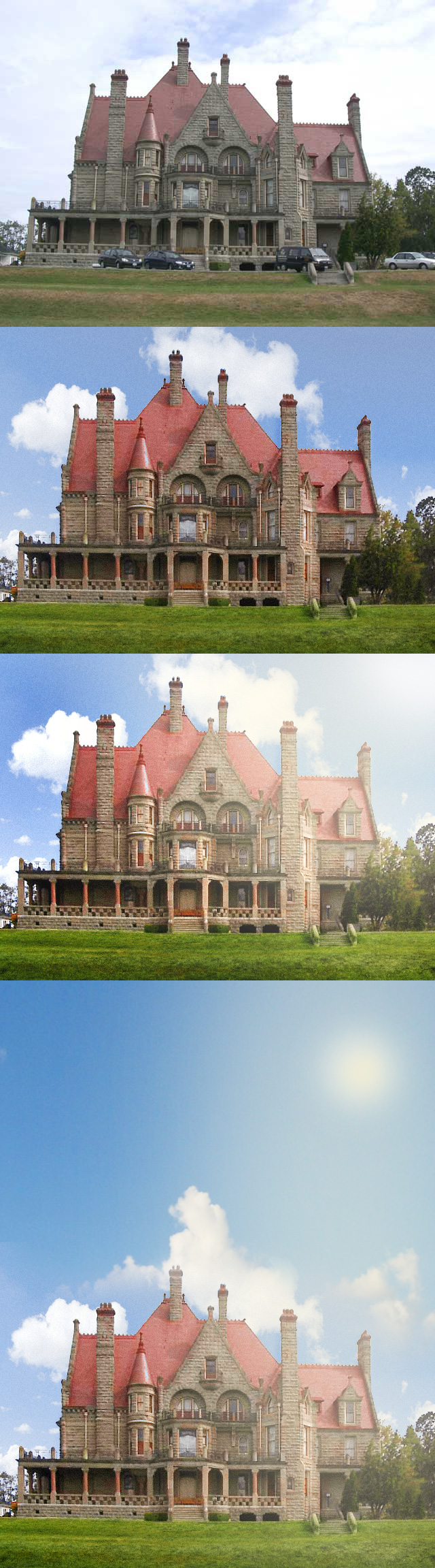 Заменим небо. Это сделает картинку более солнечной и улучшит общее настроение снимка. Маска легко создаётся предельным увеличением контраста исходного изображения через «уровни»:
