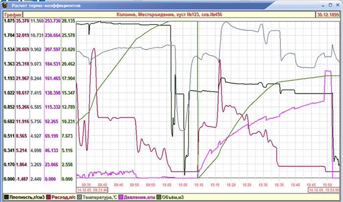 График отражает процесс заливки нефтескважины. Строится в реальном времени (также после окончания работы вставляется отчёт о заливке).