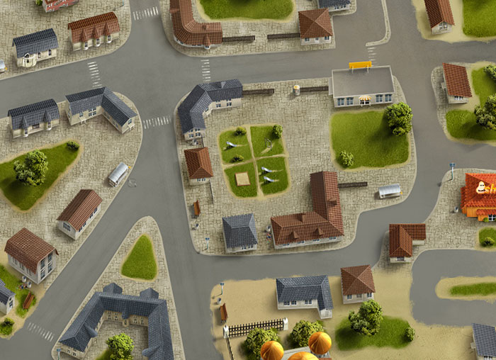 Не проще ли в данном случае построить сцену полностью в объёмном редакторе? Учитывая размер домиков, сойдут низкополигональные модели. Тени и глобальное освещение сделают своё дело. Если есть время, целесообразно запустить просчёт по слоям — отдельно освещение, отдельно тени, отдельно отражения (если есть), отдельно глобалку.