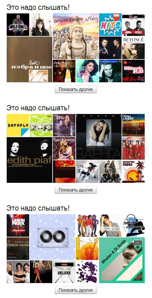 Попробовали сделать — возникла проблема: большие картинки, когда их две, периодически наезжали друг на друга. Ребята-разработчики учли это в алгоритме. Тут вылезла другая штука — белые бордеры. Получалось вот что: у маленьких обложек размер 75, а у больших — 150. Плюс, границы по одному пикселю. Соответственно, когда две маленькие ложились рядом с большой, получалась нескладуха (75 + 2 бордера) × 2 ≠ 150 + 2 бордера. В итоге, придумали просто обрезать маленькие обложки на вёрстке до 74. Незаметно, зато и ложится всё ровно, и интервалы визуально одинаковые. Конечно, если бы бордеров не было, всё было бы проще :-)