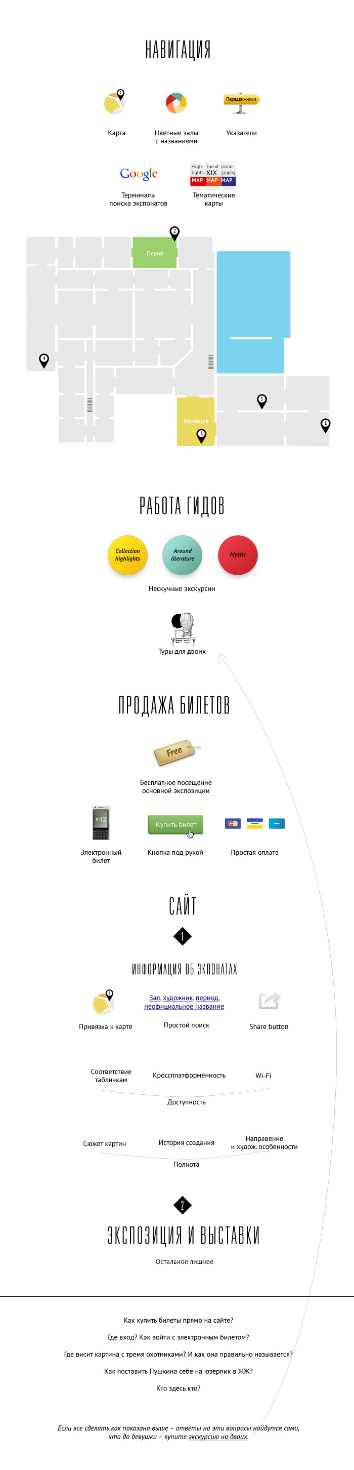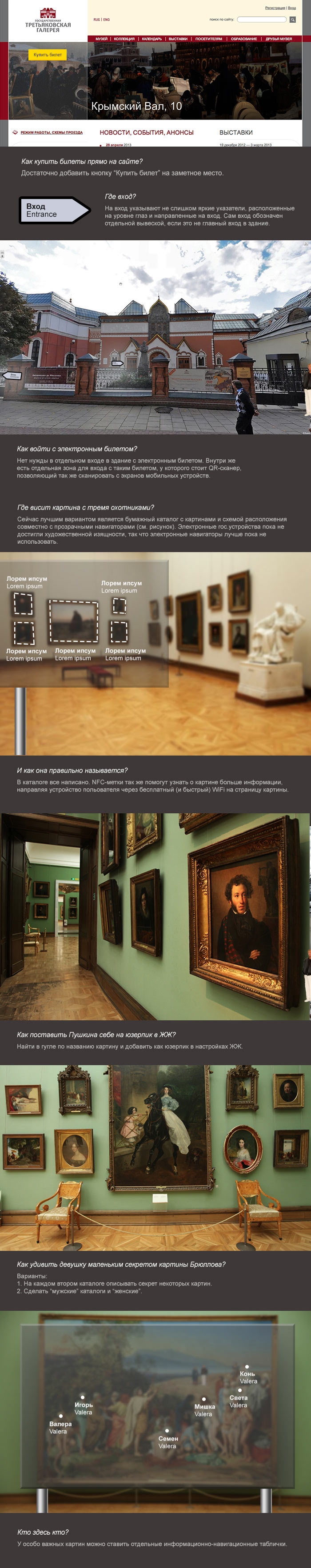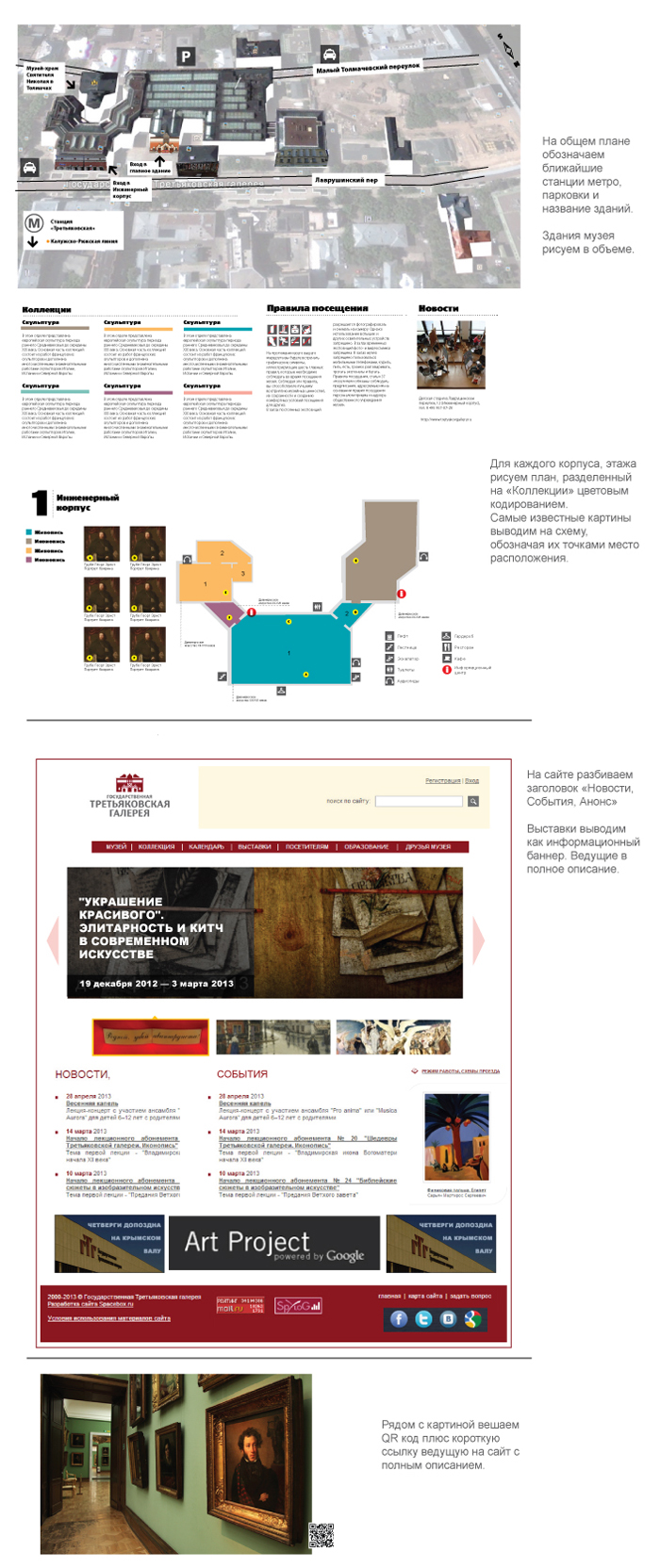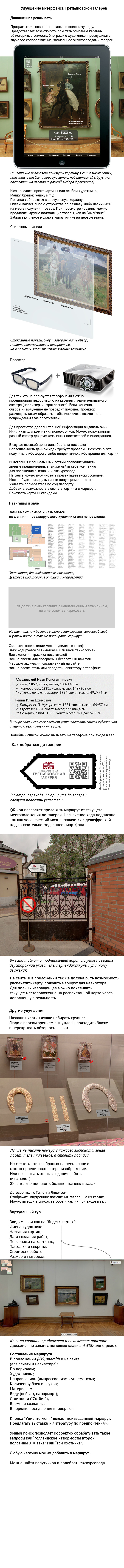 Каждый зал должен быть подписан не только при входе, но и внутри, иначе забываешь, где ты сейчас. Подписи стоит сделать чуть выше уровня глаз, а не под потолком, как сейчас. Картины я бы подписал на уровне глаз, а не снизу, чтобы не нагибаться. И лучше чёрным по белому. Но с уважением к самим картинам; всё-таки они здесь главное и ничто не должно отвлекать на себя внимание. Под названием картины следует привести описание, любопытные сведения и прочее. Метки для аудиогида должны быть у каждой картины, чтоб при введении номера в устройство, которое выдают на входе, проигрывалось соответствующее описание. Описание переходит само к следующей картине. Счастливым обладателям Айфона будет ещё лучше — они смогут наводить сотовый на картину, а приложение «Третьяковка» будет отображать описание и прям на изображении указывать, кто где нарисован и на какие мелочи стоит обратить внимание. Рисунки можно будет помечать кнопкой «нравится», они будут сохранены в любимых.