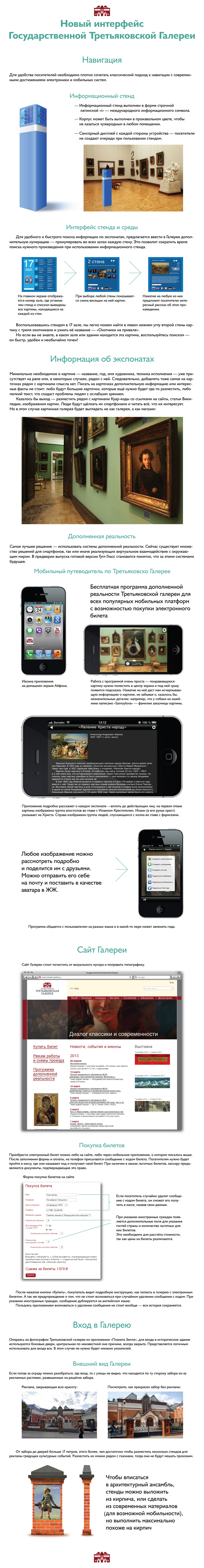 Заключение: я описал два видения решения — будущее и современное, ведь считаю, что для построения хорошего интерфейса сегодня полезно представлять что его заменит через 4 года. Полезно также не думать о технических ограничениях. Интерфейс будет развиваться в сторону упрощения, очеловечивания и пользы, а все технические открытия этому послужат. В будущем не нужно будет вводить пароли, каждый пользователь будет иметь личный опознавательный номер в сети для всех сайтов, не нужно будет подтверждать платеж, за нас это будет делать считыватель сетчатки глаза, не нужно даже думать о том, куда идти, личный электронный помощник все подскажет. Всё сведется к простому: — завтра хочу в Третьяковку, — билет куплен.