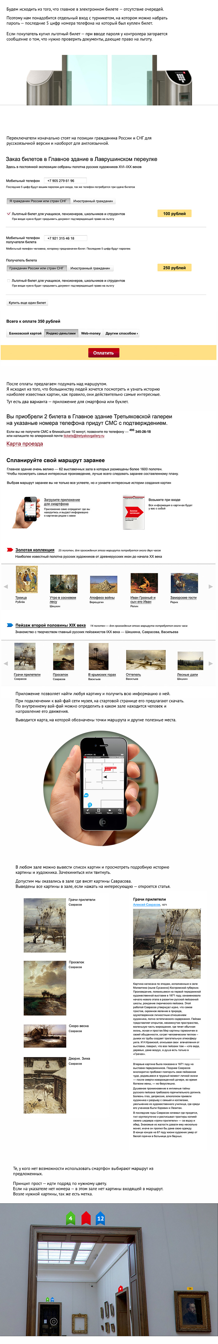 Далее человек выбирает способ оплаты, вводит данные и получает электронный билет, который может распечатать или загрузить в сотовый. На билете присутствуют ещё кое-какие важные сведения: на рыжей ветке две остановки «Третьяковская» (договаривайтесь с друзьями встречаться на улице), карта проезда во все здания, время работы, средняя продолжительность посещения, телефоны.