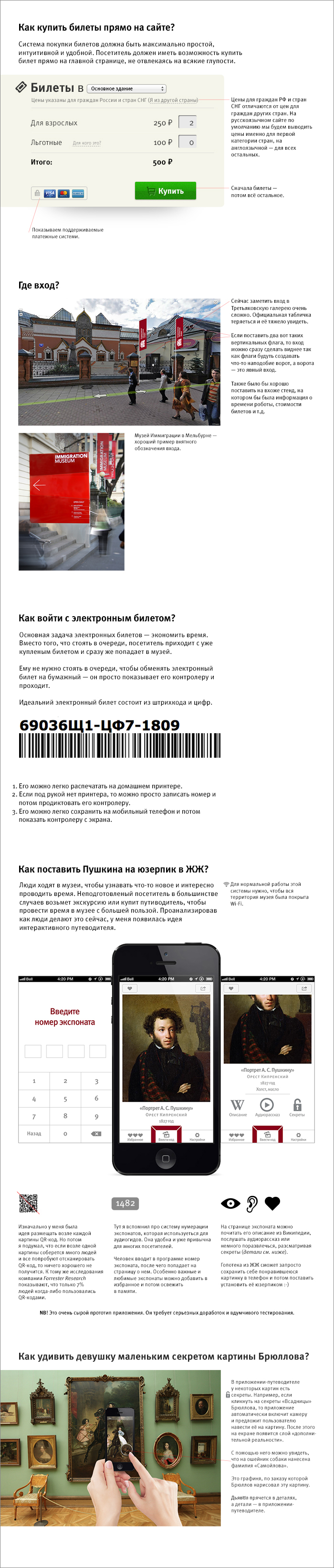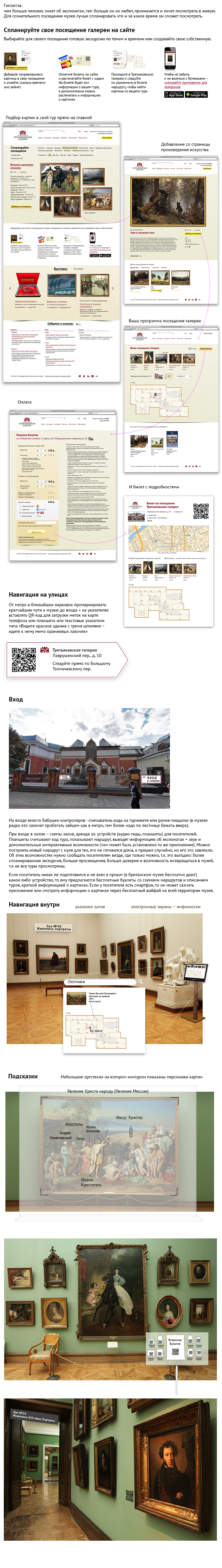 Я опишу два решения — для недалекого будущего и для настоящего. Первое решение опишу поверхностно, второе — подробнее. В обоих случаях человеку нужно сообщить важные сведения, которые, чтобы не повторяться, выношу за скобку: — Билет стоит 250 рублей. — Разрешение на съёмку — 200 рублей. Со вспышкой снимать запрещено. Если щелкать на сотовый или планшет, то разрешение не требуется. — Можно взять экскурсовода или аудиогида. — Зданий у галереи несколько — главное и второстепенные. На сайте есть описание зданий. Если не можете выбрать, то идите в главное, не прогадаете. — Галерея открыта ежедневно, кроме понедельника с 10:00 до 19:30 (кассы до 18:30). — Лестницы оборудованы подъёмниками для инвалидных колясок. — Третьяковка большая. Вдумчивое посещение одного лишь этажа (а их два в главном здании) займет два часа, поэтому не старайтесь обойти всё впопыхах, а лучше приходите ещё раз.