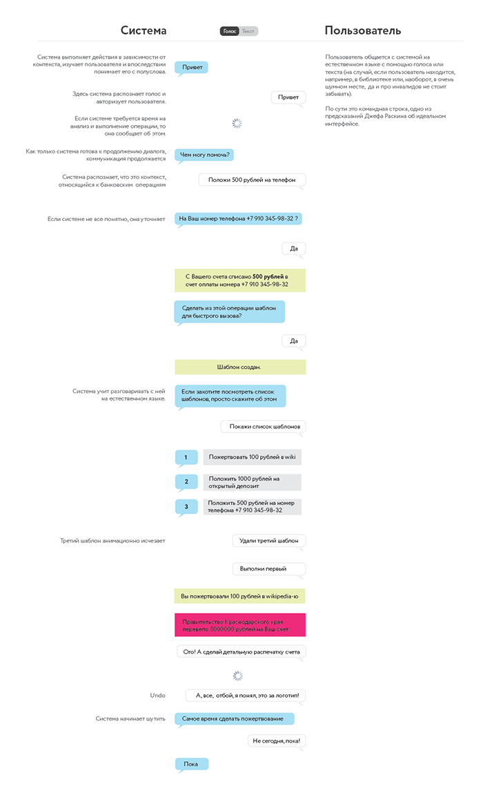 Голосовой интерфейс — один из самых неэффективных, потому что звук как носитель информации имеет крайне низкое разрешение. Пока слушаешь одно объявление в аэропорту, можно прочитать всю таблицу вылетов и прилётов. Автоответчики банков («Если вы хотите прослушать информацию о кредитных картах, нажмите 5…») ненавидят все. А такой псевдоголосовой интерфейс, когда прямую речь приходится набирать на клавиатуре, ещё хуже.