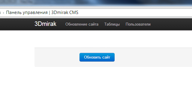 При входе в админку пользователь видит всего одну кнопку «Обновить сайт» и меню из трёх пунктов.