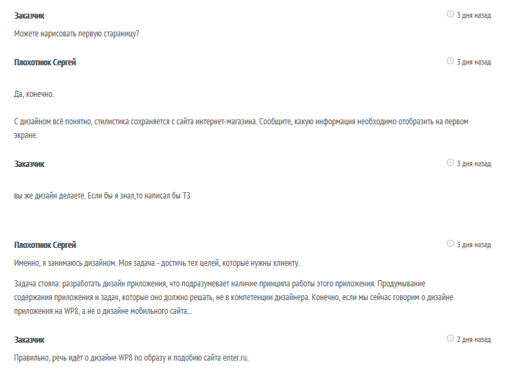 Недавно случилась такая история: откликнулся на заказ на фрилансе по поводу разработки дизайна приложения для Виндоусфона 8. Меня устроили условия клиента, а его — моё предложение. А вот дальше мы друг друга не поняли. У нас состоялся диалог, приведённый выше.