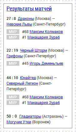 Тема вёрстки элементов таблицы спортивных результатов поднималась не раз, я прочитал ответ на каждую, на до конца свою задачу решить не смог. Дано: две команды, счёт матча Вопрос: как это сверстать, чтобы все было понятно и компактно? Свой вариант прикладываю. |