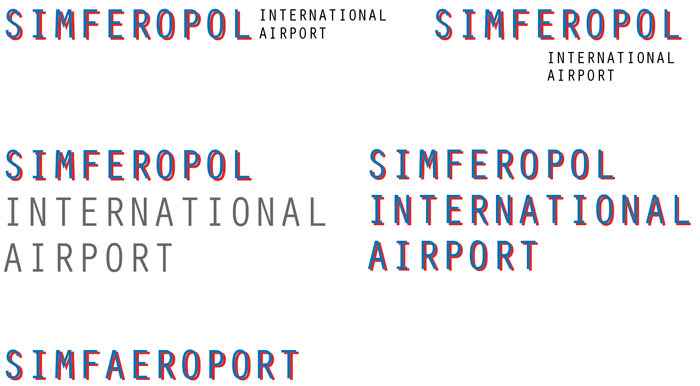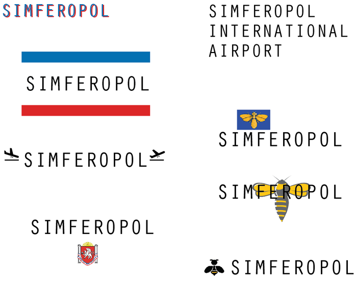 Выбираю протокольный первый вариант. Прикидываю, что с ним может происходить. Сразу вариант, вытекающий из цветов Крымского и Симферопольского флагов, тем более, что это две тонкие полоски, Дублирую шрифт, он типа из двух полосок теперь. Вариант с Крымским флагом «втупую». Вариант «прилёт—улёт». Вариант с гербом. Вариант написания полного названия одним кеглем. Вариации с пчелой с герба, Симферополь — Город Пользы, пчела — символ пользы. Но мне что-то не очень эти варианты с пчелой, которую я взял у кого-то в интернете для наброска. Шрифт, кстати, очень похож на шрифт, который использую для набора информации на посадочных талонах. Сразу видится будущий технологичный стиль.