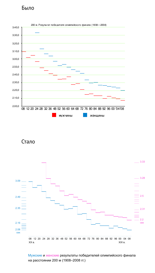 Стало быть, у вас речь идёт о плавании брассом (и время здесь в минутах, а не секундах, конечно). Ещё в заголовке вместо «результаты» я бы предложил писать более точно — «время». Тогда и идеологически правильнее будет: не «результаты падают», а «время уменьшается». И заголовок лучше ставить над, а не под графиком. А вот мужчин и женщин лучше подписать прямо на графике.