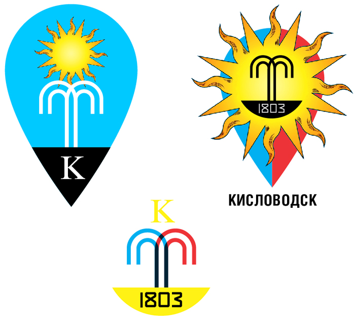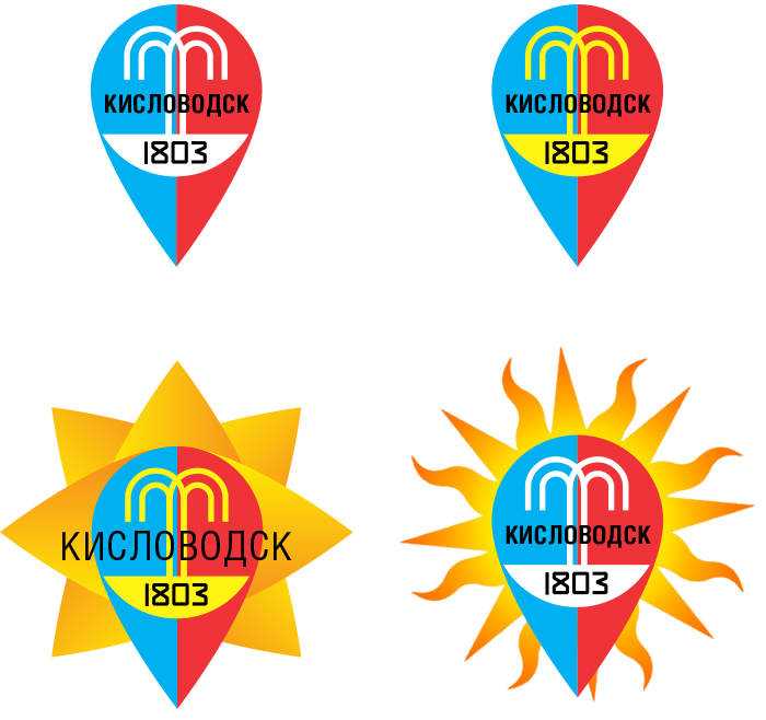 Актуально. Метафора понятна. Можно подружить солнце с флага Кисловодска с вашим вариантом. Сделать волнистые лучи, а то Почти все города — это города солнца. Слабый ход, несмотря на то, что Киcловодск — В целом — это Кисловодску стоит медитировать на свою историю, горы, воды, аллеи с южными деревьями, архитектуру. Я предлагаю отталкиваться от официальной и исторической символики. Сначала попробую увести вашу идею в сторону герба. Окей, но на объекте