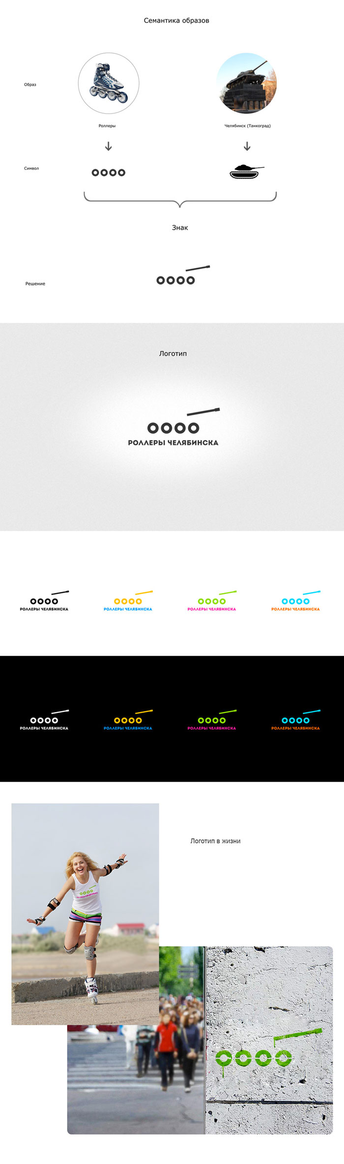 Теперь развитие. Можно написать Рооооллеры, тогда знак будет встроен в слово. Теперь логотип однороден и воспринимается цельно. Им удобно и приятно пользоваться, у вас уменьшится желание ставить знак без подписи: обычно когда надпись никакая, то её хочется убрать. Кроме того, можно создавать бесконечные версии логотипа, пуская надпись вместе с танком по кривой. У вас же весёлая и динамичная организация. Самое то.