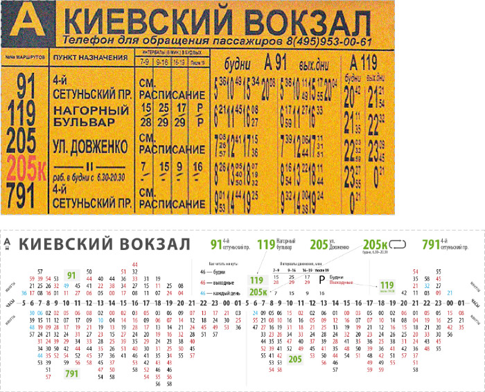В оригинальном я не понял только, почему 205к выделен красным и что значит «см. расписание». Гипотеза о том, что красность означает выходной, опровергается текстом про работу в будни. Про расписание я предположил, что оно на обратной стороне (так в Челябинске иногда делают).