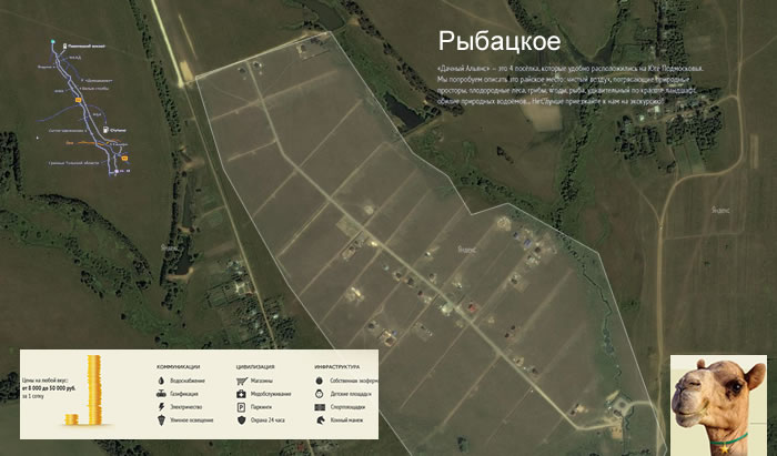 «Кусок» с участками хочется сделать крупнее и насытить деталями, вместо цветных шаров показать границы посёлков, а ещё лучше участков. Больше всего мне не нравится блок с ценами — он важный, но совершенно неинформативный: