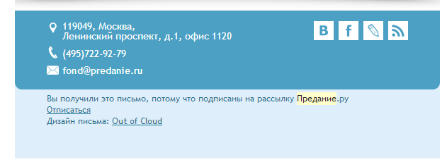 Наш вариант: «Исполнитель имеет право в футере рекламных писем, созданных Исполнителем, указать авторство со ссылкой на сайт Исполнителя. Дизайн письма: Out of Cloud. Шрифт, кегль и цвет упоминания — по соглашению сторон».