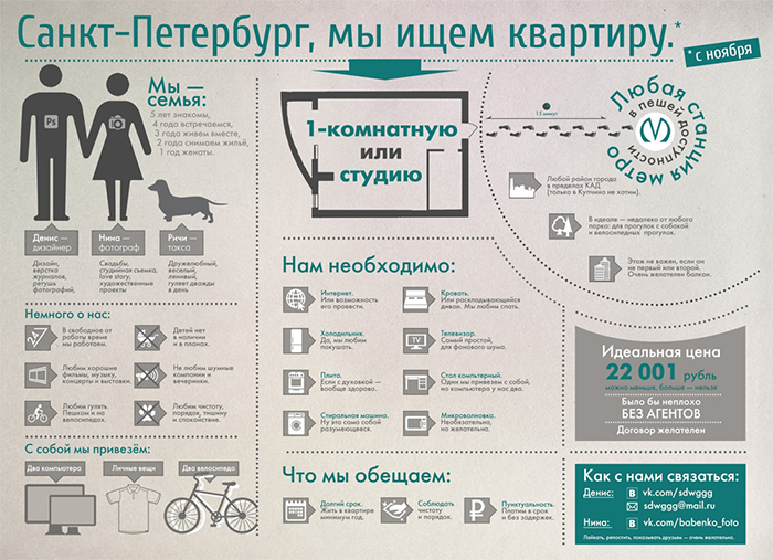 Добрый день! Сделал такое объявления для поиска квартиры. Хотелось что-то наглядное и информативное. Конечно, это не инфографика в истинном понимании этого слова. Но хотелось бы выслушать и получить советы, как улучшить или изменить данное объявление.