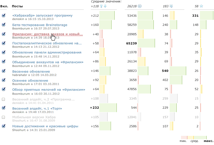 Таблица «размазана» по вертикали, из‑за этого сложно сравнивать показатели разных записей. Уменьшите высоту строк, уберите табличную разметку, избавьтесь от текстовых повторений, покажите средние и выделите максимальные значения. Для лучшего восприятия отделите числа от графического представления.