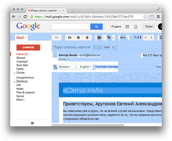Если Интересно составить гайдлайны — какие элементы включать в выделение, а какие — нет? Мне кажется, деление на интерфейс и содержание было бы слишком грубым. На вашем примере было бы удобно выделить названия папок и тему письма, хотя бессмысленно — кнопки и пиктограммы. Но логотип Гугля должен выделяться — мало ли зачем я хочу его забрать? Призываю уважаемых советчиков предложить правила и исключения. Идеально формулировать сразу в формате гайдлайна, как в бюрошном примере об обязательных полях и сообщениях об ошибках в форме. |