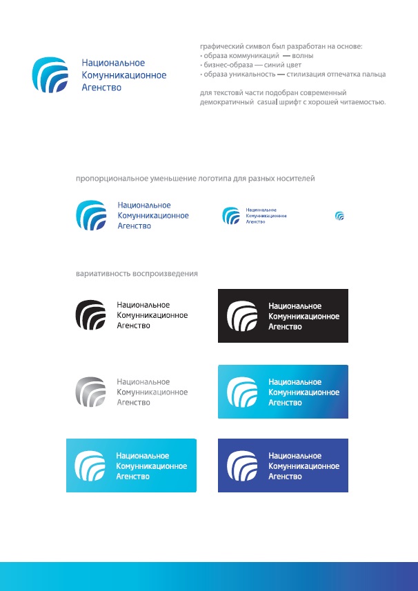 Заказчик — коммуникационное агентство, оказывающее соответствующий спектр услуг. Синий цвет — пожелание заказчика. Наличие графического элемента и полного наименования компании также часть ТЗ.