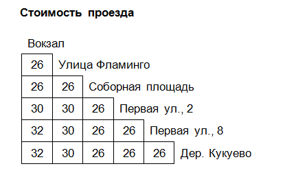 Забавно, не встречал такого. Перед тем, как улучшать визуализацию, лучше подумать о сценарии, в котором эта таблица используется. Зачем она мне вообще? Как я оплачиваю проезд? Как проверить, что я не обманываю, когда даю 26 рублей — может, я проехал на 30? Водитель Можно расписать без ребусов: