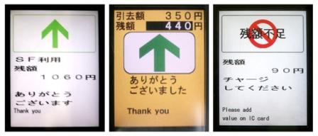 В Токио работает система оплаты проезда на общественном транспорте «Пасмо». Пассажиры пополняют баланс единой транспортной карты, которую используют для прохода через контрольные турникеты. Карту прикладывают к считывателю, с неё списываются средства и на экране отображается один из трёх ответов: «проходите», «проходите, но баланс близок к нулю» и «недостаточно средств»: