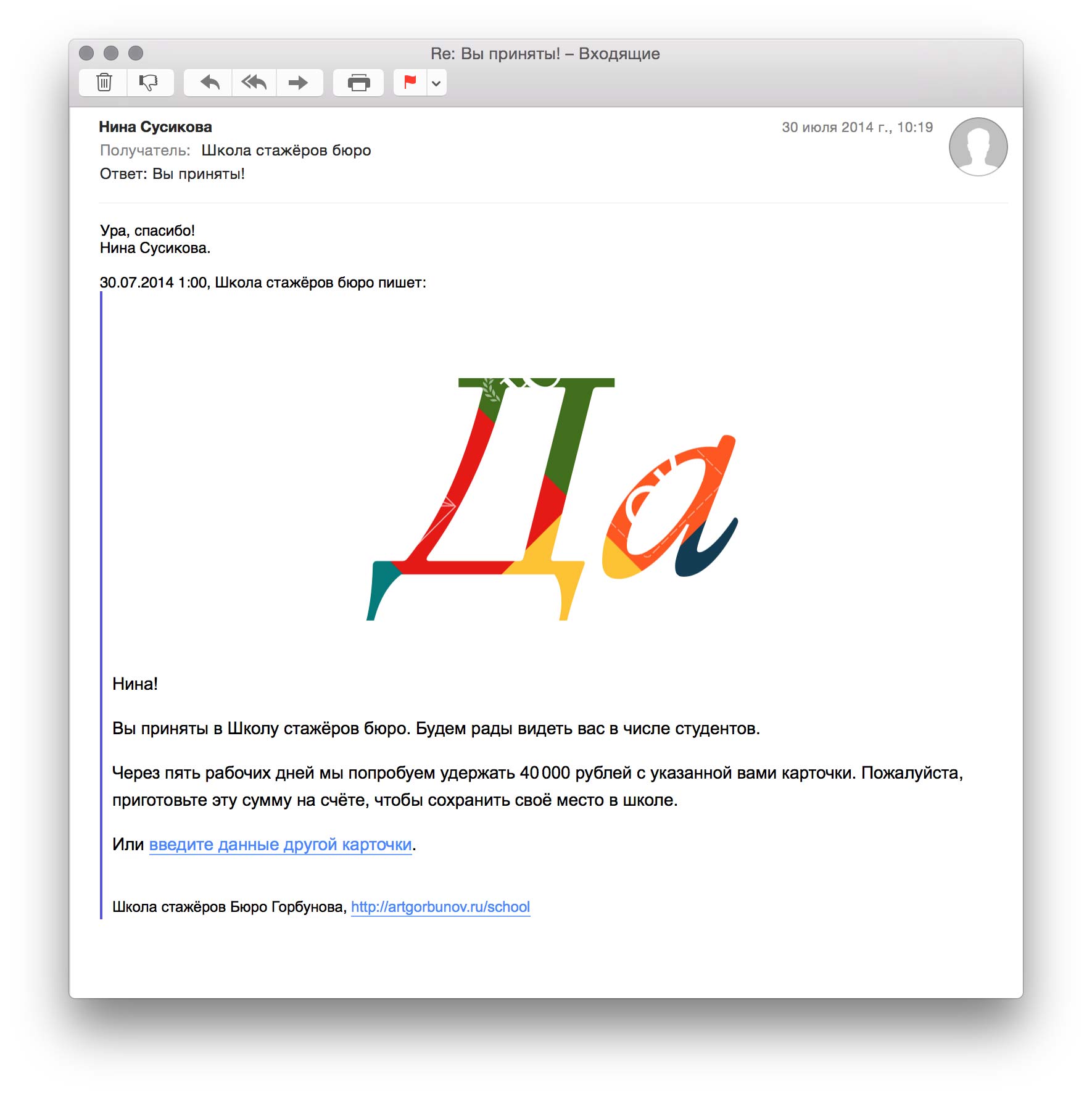Поступающие в Школу стажёров дизайнеры выполняют вступительное задание и с нетерпением ждут решения о зачислении. Как в письмах из американского университета Принстона, полезной части отдана максимальная площадь нашего ответа: