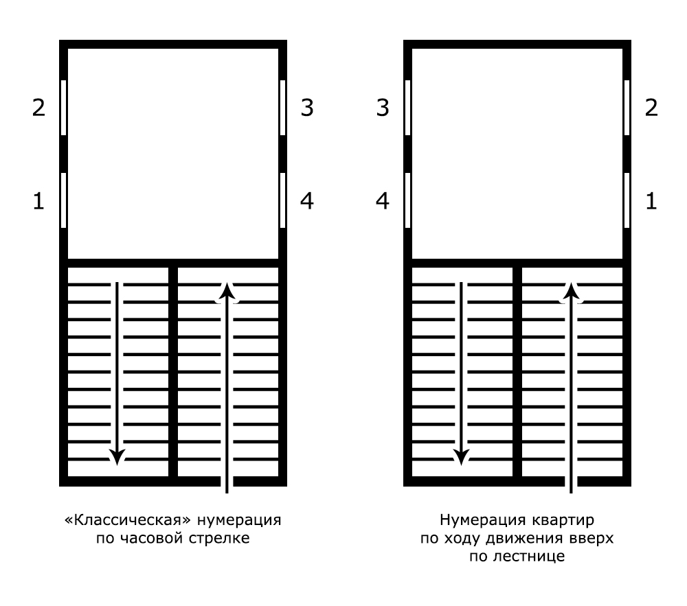 Я бы предложил не заниматься ерундой и нумеровать по часовой стрелке независимо от расположения лестниц. Рассуждения Из постановления Главы города Челябинска от 11.02.2005 N 36. Правила адресации зданий и сооружений. |