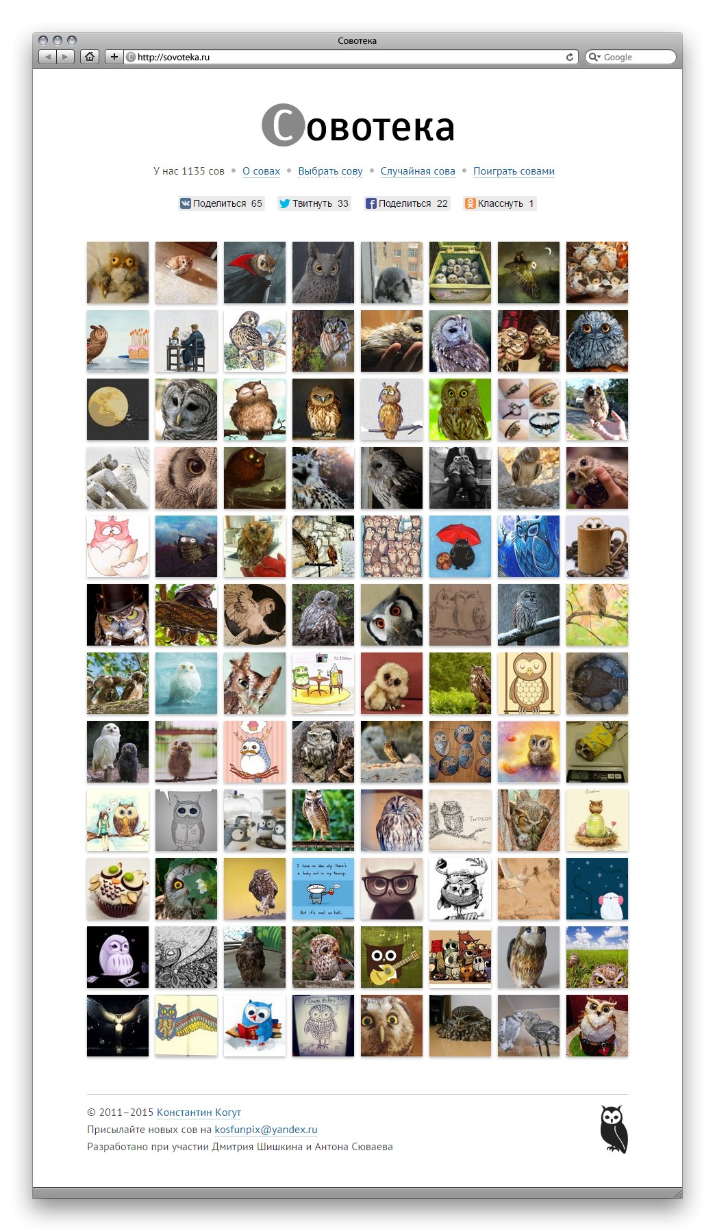 К вёрстке. Главная страница устроена по принципу плитки. Это неплохо, потому что вроде бы у нас нет задачи привлечь внимание к определённой сове. Однако даже для плиточной страница выглядит скучно: картинки одинаковые, очень маленькие и нещадно обрезаны под квадрат. В результате, чтобы хотя бы найти интересную сову, пользователь вынужден перекликать их все.