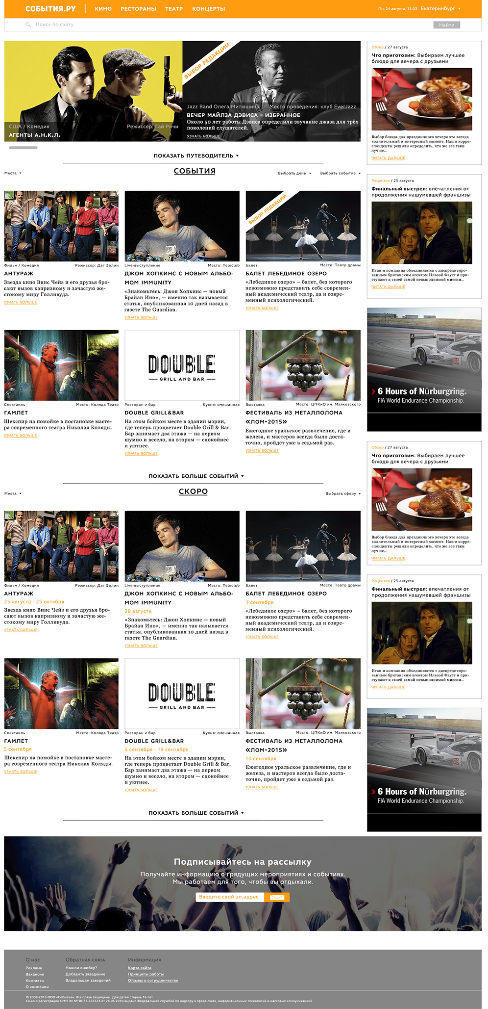 Названия главных разделов складываются с названием сайта в одно предложение. Получается нехорошо, т. к. кино, ресторан и театр не являются событиями. Возможно, получится как-то переформулировать меню. Например, «События.ру | события в мире кино, музыки, театрального искусства и кулинарии.»