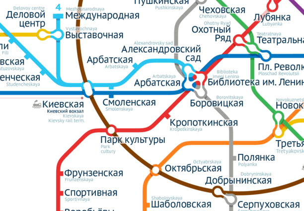 Теперь должно стать понятно, откуда взялось такое обозначение Киевской. Мало того, что там проходит три линии, так две из них ещё и должны пройти параллельно. Но склеить их в пучок нельзя — покажется, что на Смоленской есть переход: