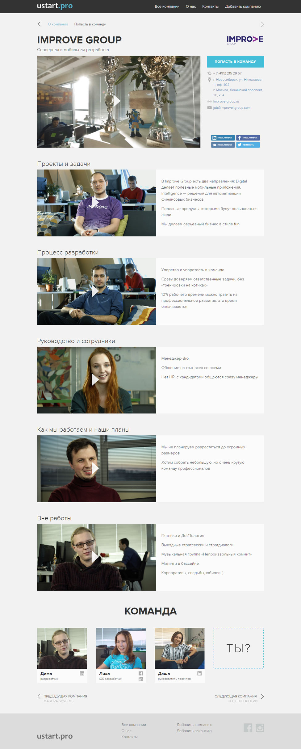 Прежде чем тратить время на говорящие головы, хорошо бы узнать кратко, что интересного делает эта команда. Текстом и осмысленными иллюстрирующими картинками, чтобы быстрее. Как вариант, можно рассказать об этом в первом вводном видео на минуту-полторы — тогда стоит указать у видоса его длину, чтобы были ясны затраты времени на просмотр.