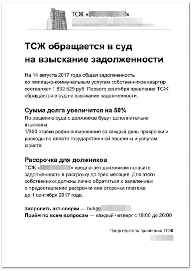 В подобных объявлениях вредно проявлять агрессию, угрожать, давить на совесть и жалость, пытаться кого-то пристыдить. Я верю, что люди будут действовать только исходя из личного интереса или чтобы избежать боли. Отсутствие охраны, лифтов, вывоза мусора и других удобств — достаточно сильная боль, чтобы начать двигаться.