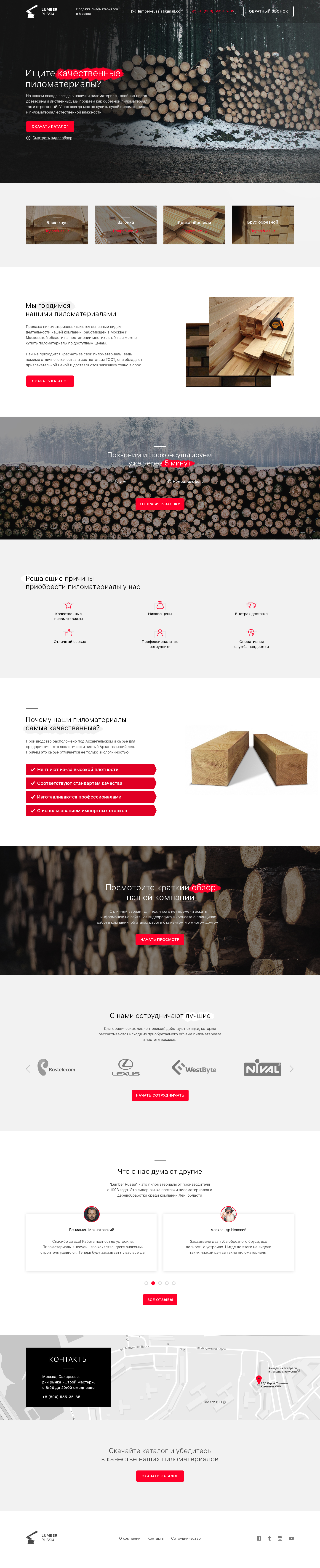 Первое, что бросается в глаза: выбранный стиль не имеет отношения к пиломатериалам. Заголовки тонким шрифтом, просторная вёрстка, серые плашки и красные акценты навевают мысли о технологичной компании, электронных устройствах или, на худой конец, стартапе. Такой стиль подходит и очень сильно напоминает сайт Теслы.