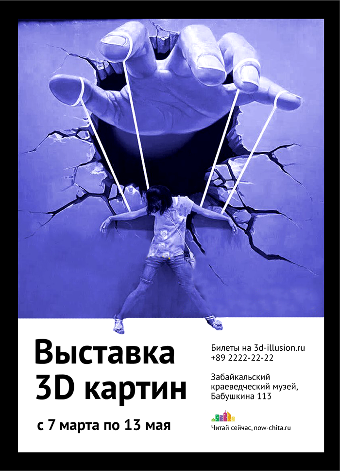 По-моему, сейчас очень большой перебор со слоганами: «Иллюзия реальности», «Окунись в омут воображений», «Покупай здесь и экономь». Они на меня не работают, поэтому оставил только «Выставка 3D картин».