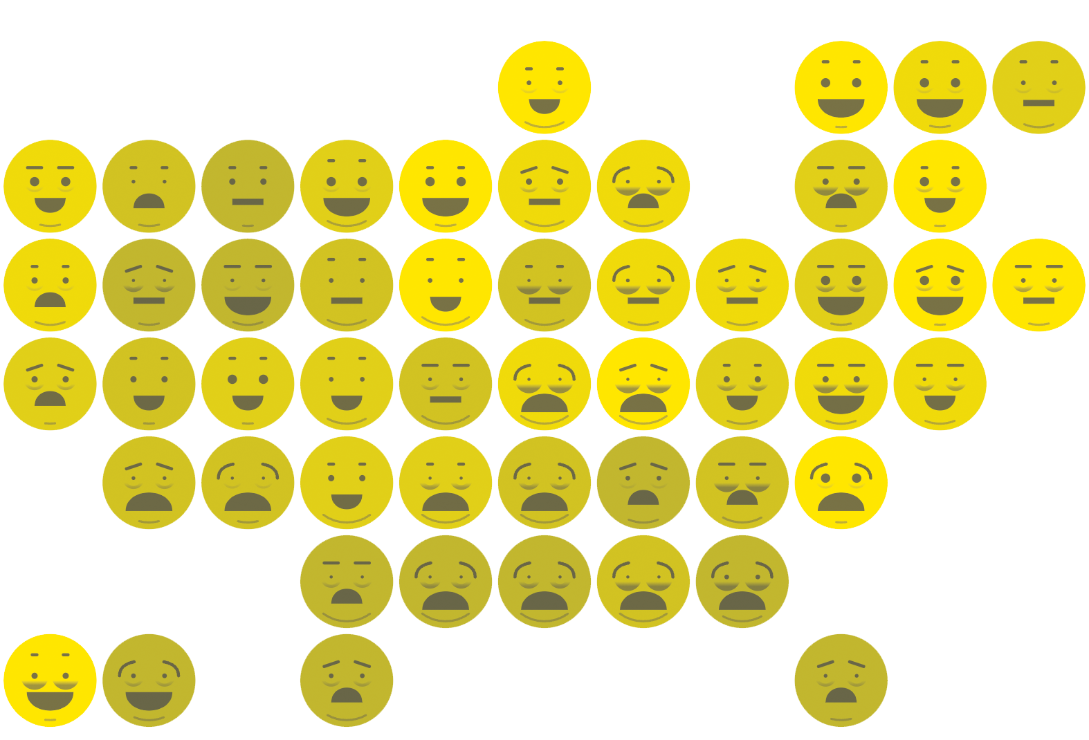 Мы видим штаты с высоким уровнем жизни: Вермонт, Миннесота, Коннектикут, видим, что на Гавайях всё хорошо, кроме хронического недосыпа. При этом лица южных штатов — Джорджии, Алабамы, Миссисипи, Луизианы — выглядят максимально грустными. Мне ещё нравится, как на себя обращают внимания лица с необычным выражением, например, Нью‑Джерси с огромными глазами и мешками под глазами в сочетании с высоким уровнем безработицы, Аляска с высокой безработицей и при этом относительно нормальным достатком или весёлая и полненькая Айова с уверенностью глядящая в будущее.
