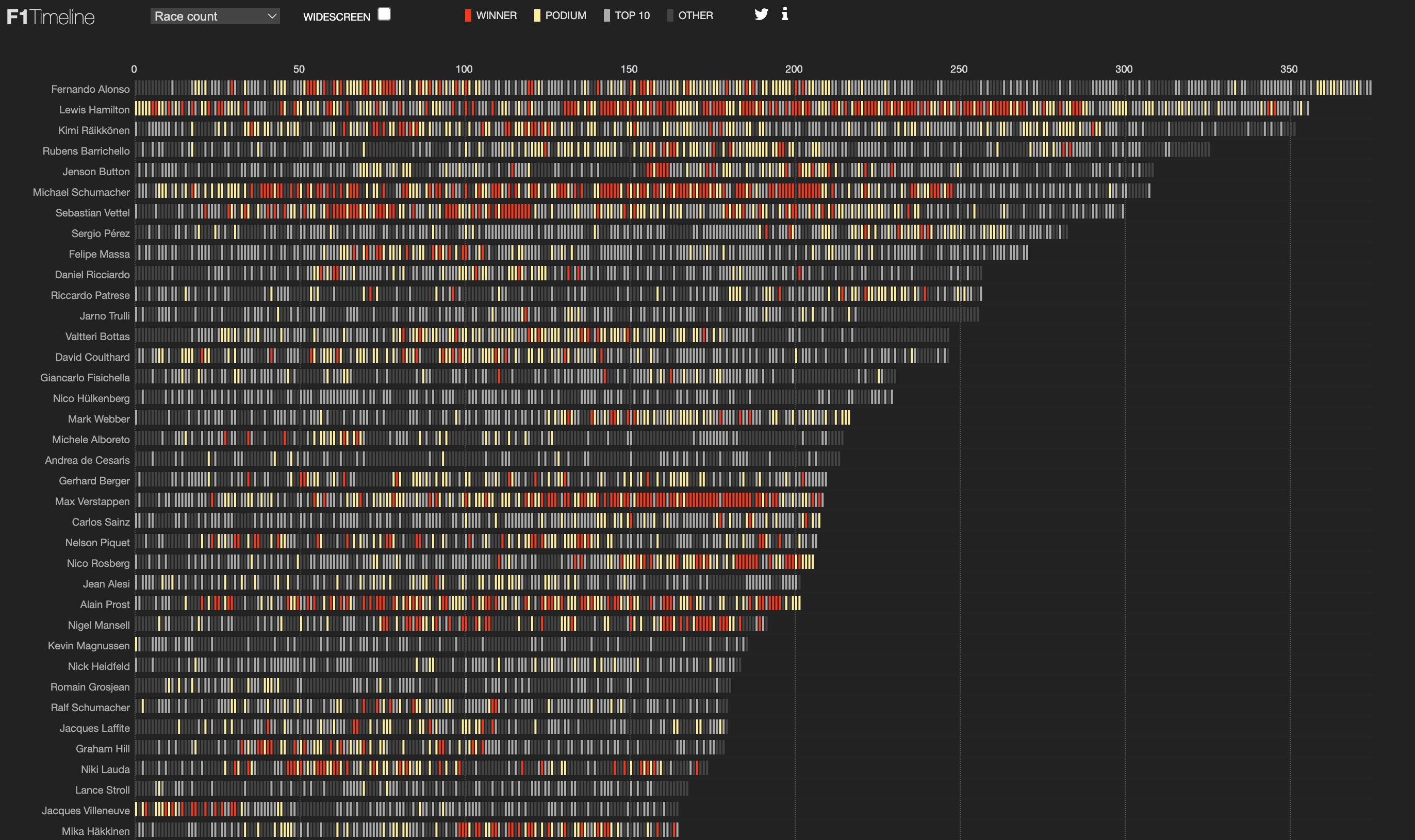Обратите внимание, что длина столбика по горизонтали буквально представляет собой количество заездов, то есть показывает активность гонщика, но при этом отдельные заезды различимы и, благодаря цветовому кодированию, мы знаем, насколько успешным был каждый заезд. Порядок заездов внутри столбиков также показывает хронологию успехов каждого гонщика, где последовательность из красных чёрточек обозначают непрерывную серию побед. При наведении видна подробная информация о заезде: дата, место проведения, имя гонщика и его место на пьедестале.